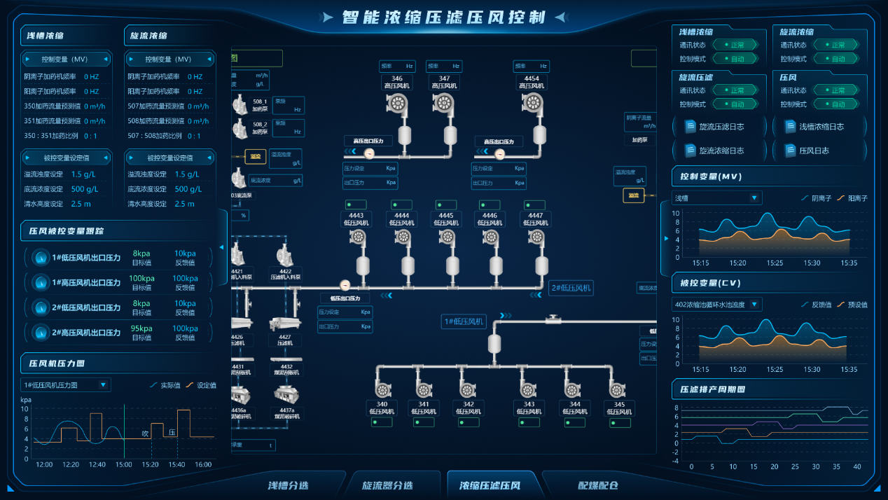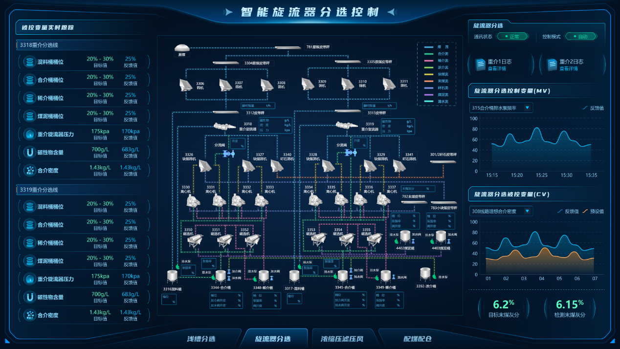 “數據-模型雙驅動(dòng)的選煤廠(chǎng)智能控制與決策系統的研究與應用”項目研發(fā)了“數據-模型雙驅動(dòng)”的選煤廠(chǎng)控制系統,融合模型預測控制(MPC)、無(wú)模型自適應控制(MFAC)與多輸入多輸出預測模型控制,實(shí)現了重介分選、濃縮壓濾、精準配煤等環(huán)節的毫秒級閉環(huán)控制。
