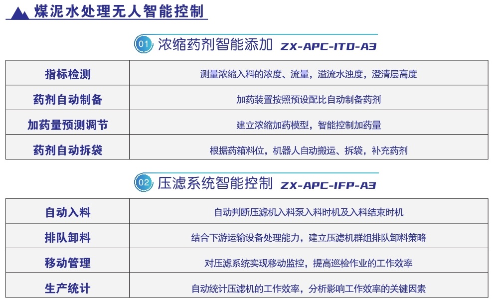 借助各類(lèi)高精度傳感器,實(shí)時(shí)監測煤泥水的流量、濃度,溢流水濁度,澄清層高度等關(guān)鍵指標,建立干粉自動(dòng)添加、藥劑智能配制加藥模型,實(shí)現根據生產(chǎn)煤泥水濃度、流量變化改變加藥量;同時(shí)利用拆包機器人解決干粉的搬運、拆包以及補充,實(shí)現濃縮加藥全流程的無(wú)人值守。智能加藥算法準確率大于98%,加藥量降低3%。