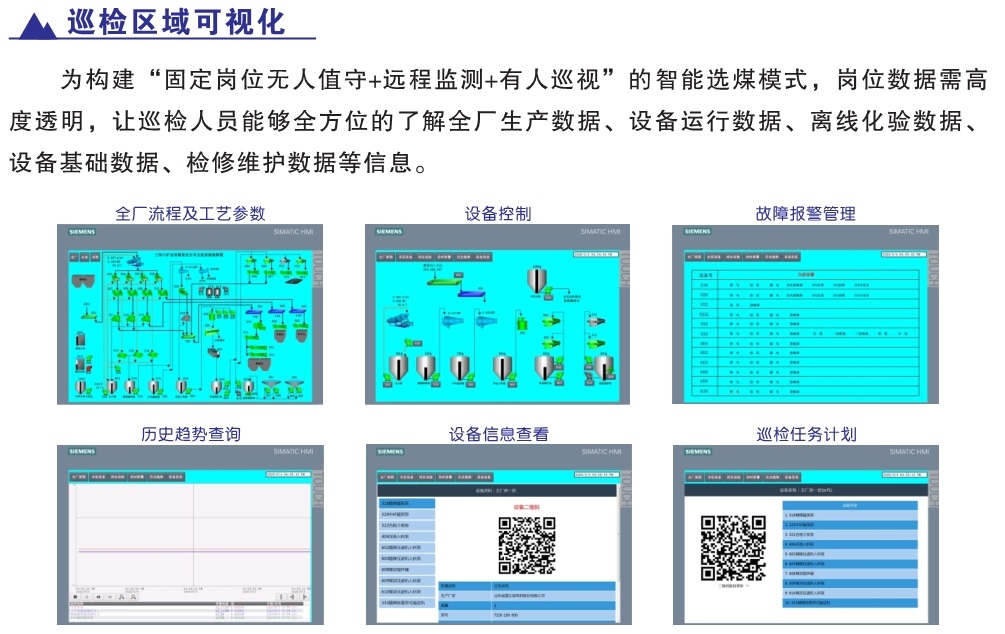 產(chǎn)品簡(jiǎn)介:構建“固定崗位無(wú)人值守+遠程監測+有人巡視”的智能選煤模式,崗位數據需高度透明,我公司提出用觸摸屏代替傳統控制箱,通過(guò)觸摸屏與管控平臺的對接,讓巡檢人員能夠全方位的了解全廠(chǎng)生產(chǎn)數據、設備運行數據、離線(xiàn)化驗數據、設備基礎數據、檢修維護數據等信息。建立智能啟停車(chē)診斷系統,充分利用集控系統、配電系統、視頻分析系統、設備預測性維護系統、檢修任務(wù)進(jìn)度等信息,建立啟停車(chē)前人機環(huán)境評估、生產(chǎn)過(guò)程異常數據分析以及發(fā)現問(wèn)題后的消息推送與執行策略。